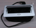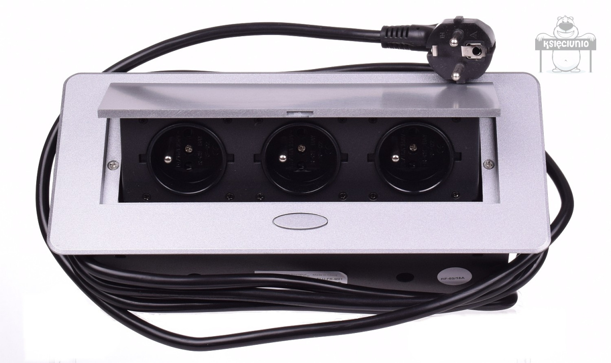 Listwa zasilająca do montażu w blatach meblowych, wykonana z metalu.