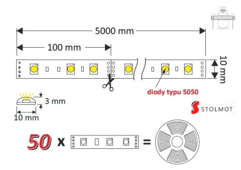 Taśma LED typu RGB świeci w różnych kolorach np. biały,czerwony,niebieski,żółty,fioletowy. Aby taśma działał prawidłowo potrzebny jest jeszcze kontroler . Do zasilenia 5m taśmy należy użyć zasilacza lub transformatora prądu stałego o mocy ok 50W. Na tylnej części znajduje się klej 3M ( taśma klejąca) co znacznie ułatwia montaż.