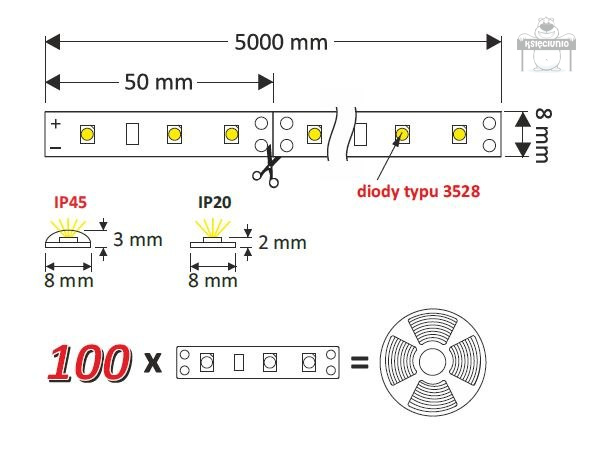 - Taśmy o długości dłuższej niż 5m łączymy ze sobą równolegle .